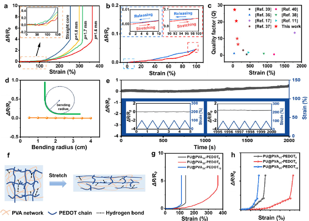 如图3所示,所得导电纤维表现出良好的抗拉伸干扰性能(在100%应变下电阻变化率低于5%),具备长期工作稳定性。通过对导电聚合物水凝胶内芯的半互穿网络在拉伸过程中导电性能的变化情况进行深入研究,揭示了该纤维导电性的抗拉伸干扰机制。