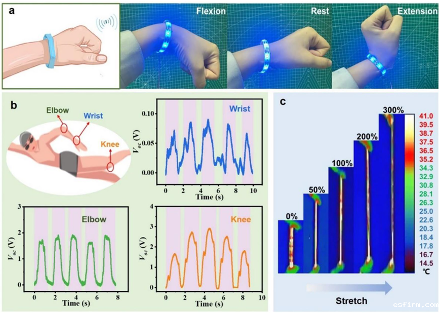 最后,凭借PU@PVA-PEDOT:PSS SI-CF出色的抗拉伸干扰性能,将其应用于可拉伸导电纤维、自供电传感纤维及可拉伸电热纤维领域,如图4所示。