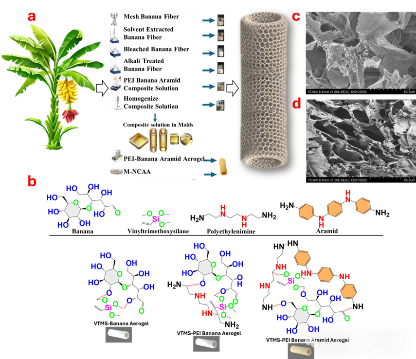 天津工业大学纺织科学与工程学院张美玲/林童教授团队开发了一种基于表面改性香蕉茎秆纳米纤维素的气凝胶吸附材料,可高效去除水体中的全氟与多氟烷基物质(PFAS)。研究团队通过复合聚乙烯亚胺(PEI)和芳纶纤维,并经乙烯基三甲氧基硅烷(VTMS)疏水化改性,构建出高比表面积的仿生分级孔结构。该材料具有超高效吸附性能:在120~180分钟内将多种PFAS(PFOS、PFNA、PFHxS、PFBS等)从初始浓度1000 ppb降至2.87 ng/L(ppt),远低于EPA 2024年饮用水限值标准(如PFOS限值为4 ng/L);具备广谱吸附优势:对长链PFAS(如PFOS、PFNA)的去除率>99.9%,显著优于传统活性炭与MOFs材料;同时还具有卓越的循环稳定性:经15次吸附—脱附循环后仍保持92.3%的吸附容量,展现出优异的机械与化学稳定性。相关成果以“Effective PFAS removal from water using vinyltrimethoxysilane-modified polyethyleneimine-aramid-banana nanocellulose aerogels”为题,发表在环境领域Top期刊《Separation and Purification Technology》上。