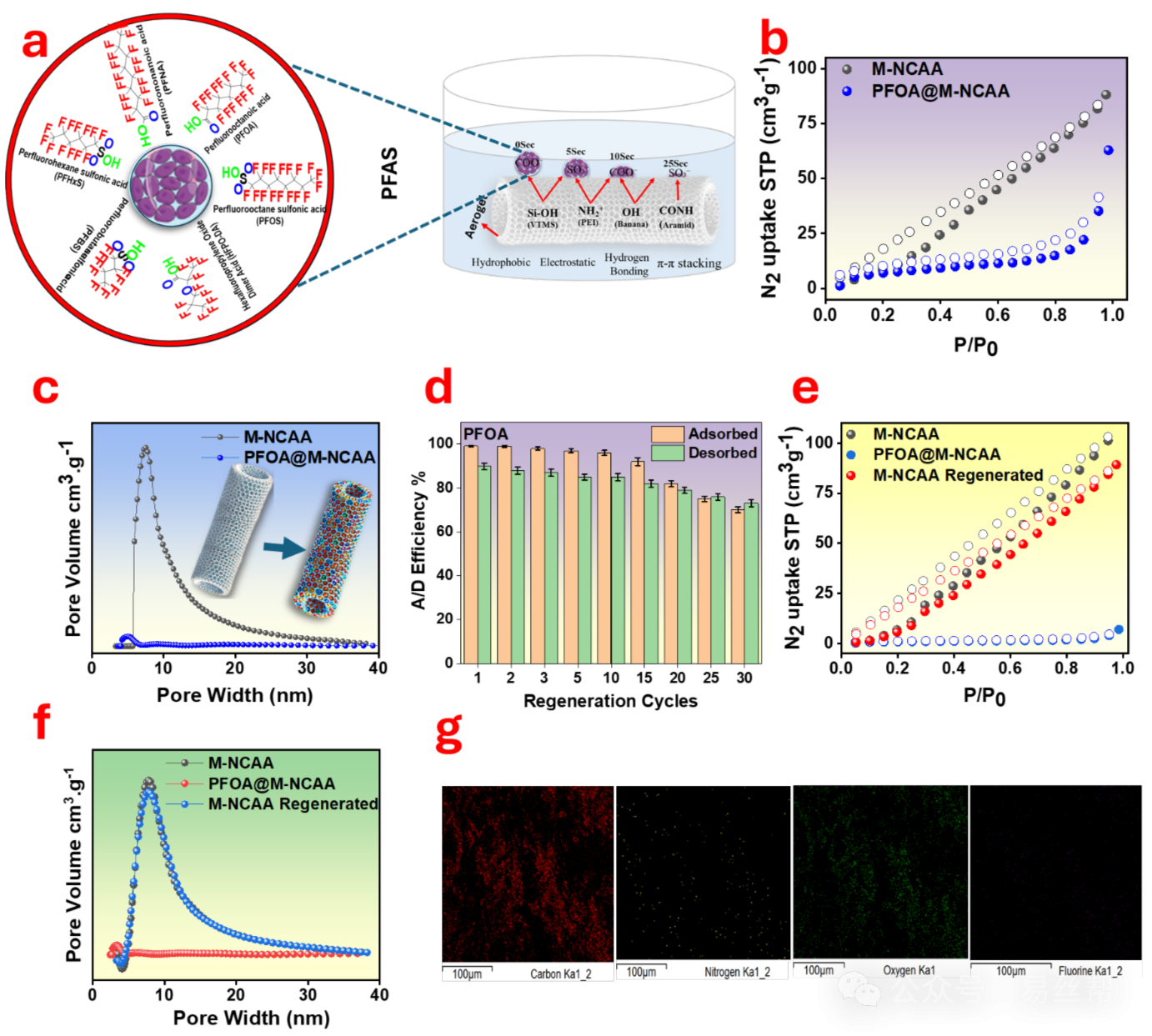 在初始浓度为1000 ppb的PFAS溶液中,M-NCAA在2~3小时内即可将各类PFAS浓度降至2.87~8.9 ppt,其最大吸附容量达到1337 mg/g(以PFOS为例),显著优于未经改性的NCAA。不同形貌结构(中空、片状、球形等)材料的吸附效率存在差异。在水中加入非离子或阳离子表面活性剂可提升材料的PFAS吸附能力,而阴离子则会降低其吸附性能。材料对PFAS展现出广谱吸附特性,Langmuir模型拟合证实了单层化学吸附过程。
