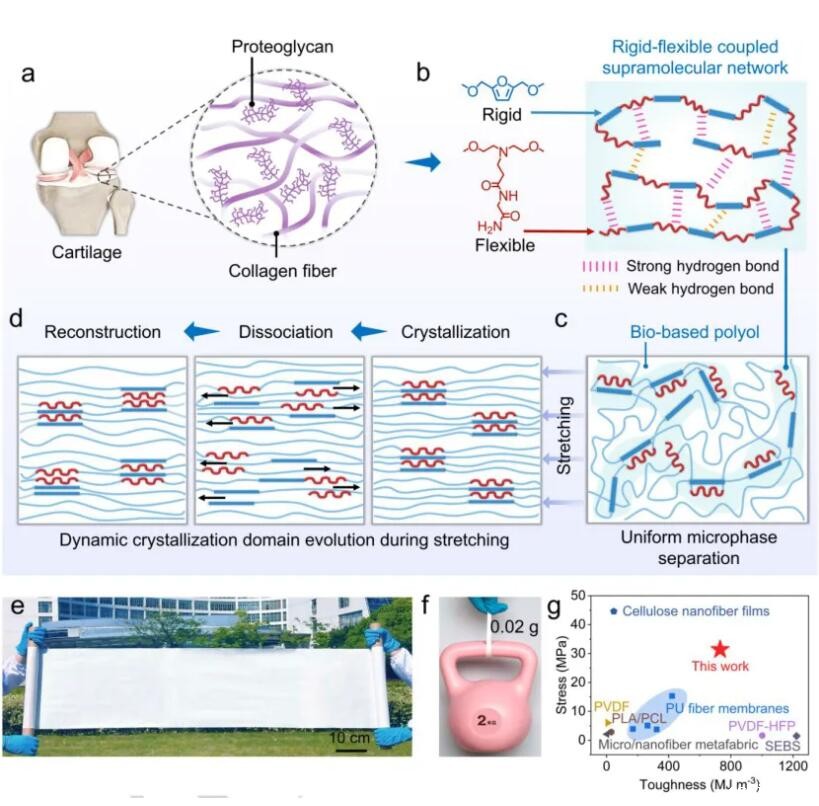 东华大学丁彬教授、王先锋教授团队受关节软骨多级异质结构启发,提出“刚柔耦合超分子交联网络”的创新设计策略。通过将刚性呋喃环(BHMF)与柔性丙烯酰甘氨酰胺(HNAGA)不对称耦合到分子链中,构建具有键能梯度分布的动态氢键网络,实现软相(非晶区)与硬相(晶区)的均匀微相分离(图1b-c)。基于此制备的生物基聚氨酯经静电纺丝形成纳米纤维膜(UTBNM),其硬相在拉伸中转化为动态结晶域(图1d),通过氢键可控断裂与重组实现多级能量耗散。该材料展现出超高强度与韧性(断裂强度31.37 MPa,断裂应变731.04%,韧性102.13 MJ/m³),性能远超现有纳米纤维膜(图1g),为智能穿戴和生物医疗领域提供全新解决方案。