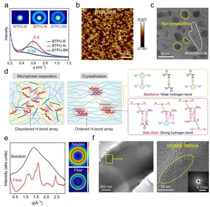 同步辐射小角X射线散射(SAXS)证实BTPU-BN具有均匀微相分离结构(图2a),硬相尺寸(3.59 nm)小于单一柔性体系(BTPU-N)。原子力显微镜(AFM)和高分辨透射电镜(TEM)显示硬相(暗区)与软相(亮区)界面清晰且分布均匀(图2b-c)。分子动力学模拟揭示刚柔耦合使氢键密度提升至61.7%(单一体系仅40%-50%),并形成键能梯度(7.61–23.58 kcal/mol)。电纺过程中,非晶分子链在拉伸下重排形成“局部结晶-全局非晶”动态结晶域(图2d-f),单纤维强度达0.58 GPa(图2f)。
