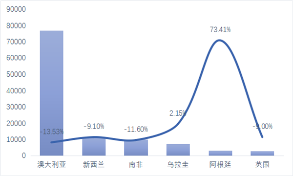 2025年1~5月中国进口主要产毛国羊毛数量与同比情况(单位:吨,%)