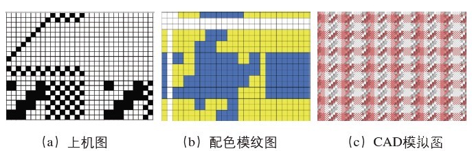 图 1 上机图、配色模纹图及CAD模拟图
