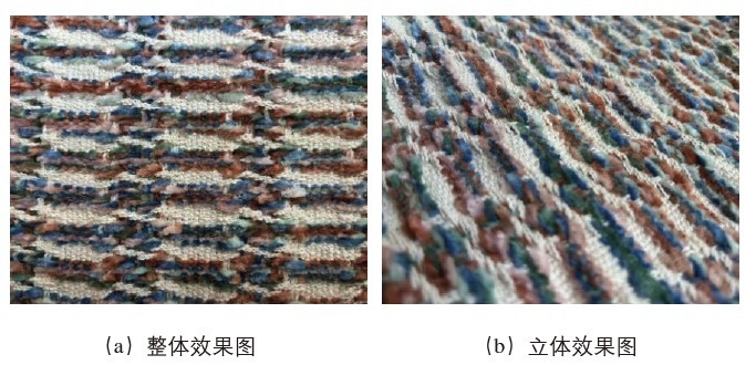 采用 6 片综框织造,4 片综框用来进行图案的织造,两片综框用来织造布边。经纬纱为波浪纱和段彩雪尼尔纱,均以 4∶4 的规律进行穿综和喂入。该面料的规格参数如表 2 所示。