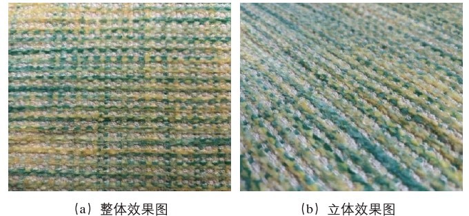 油菜花是春天的黄色使者,代表生机与希望;阳光下的油菜花田有一种梦幻般的美感,让人仿佛置身于童话世界。对色织物进行配色模纹设计,使布样上呈现出凹凸的绒点,犹如草原上开满了油菜花。其上机图如图3(a)所示,配色模纹图如图 3(b)所示,纺织CAD模拟图如图 3(c)所示。