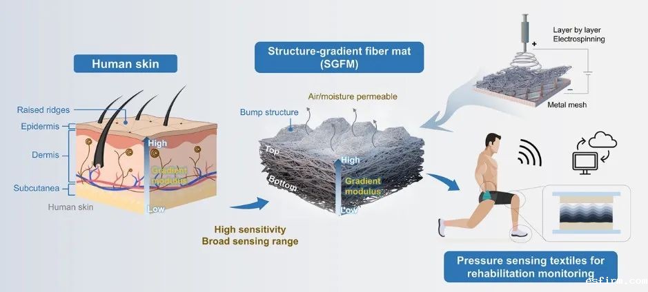 近期,香港理工大学黄琪瑶课题组在Advanced Fiber Materials上发表了题为“Skin-inspired,Permeable,Structure-gradient Fiber Mats for Pressure Sensing in Rehabilitation Assistance”的研究成果。该研究设计出一种模拟人体皮肤特性的透气梯度结构纤维毡(Structure-Gradient Fiber Mat,SGFM),用于摩擦电压力传感织物的合成。基于模板辅助逐层静电纺丝技术制备的SGFM,成功模拟了人体皮肤的机械梯度特性。这种独特的结构设计使得SGFM基摩擦电压力传感织物展现出优异的传感性能,其在0~53 kPa和53~660 kPa压力范围内,分别实现了0.068 kPa-1和0.013 kPa-1的高灵敏度。进一步将该材料集成于可穿戴康复监测系统,实现了对脉搏信号、股四头肌活动状态及足底压力的实时监测,为姿势追踪与矫正提供了可靠的技术支持。这一创新成果在提升康复辅助效率方面展现出显著的应用潜力,为智能康复设备的发展提供了新的解决方案。