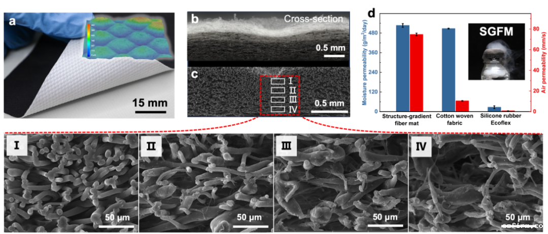 研究团队采用模板辅助的逐层静电纺丝方法构建SGFM的梯度结构,通过调控纺丝溶液中功能材料的比例来实现其梯度特性。在静电纺丝过程中,以金属网收集器为模板,使SGFM表面形成类似人类皮肤纹理的凸起结构。纤维毡的结构从顶部到底部的纤维分布逐渐由致密变得疏松。由于纤维毡的多孔结构,SGFM表现出优异的透气性(74 mm/s)和透湿性(528 g/(m2·d)),与棉织物相当,且显著优于硅橡胶,突显了其穿戴舒适性。