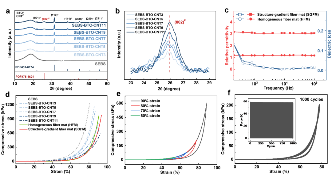 采用逐层静电纺丝工艺调控碳纳米管(CNT)浓度,诱导纤维毡结构的渐进性转变,构建出的SGFM在厚度方向上实现了材料组成、介电常数和机械性能的多方面梯度分布。这种多尺度梯度结构有效增强了传感器的灵敏度和压力检测范围。
