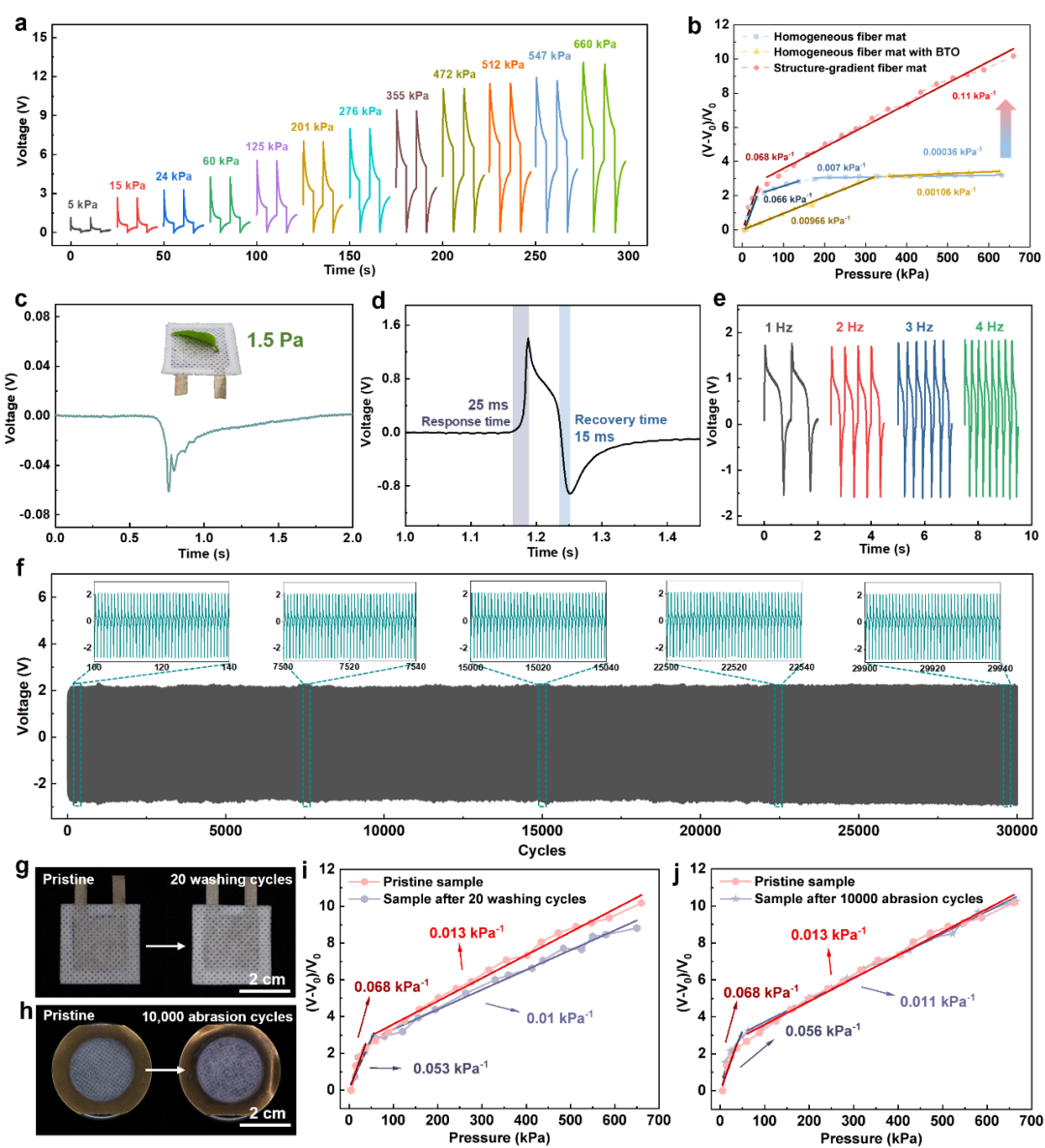 施加压力从5 kPa增加到660 kPa,基于SGFM的摩擦电压力传感织物的开路电压从1.1 V增至11.1 V,展现出宽压力范围内的高灵敏度。得益于SGFM的高相对介电常数、低介电损耗及独特的梯度结构,该压力传感织物在大压力范围内的综合性能优于传统HFM和HFM-BTO织物。