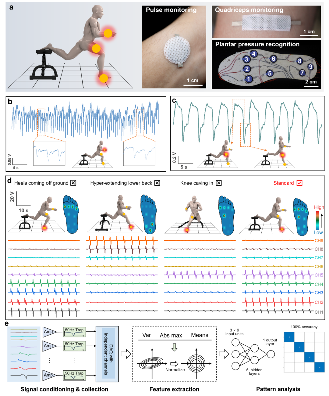 为验证该研究的实际应用价值,开发了基于SGFM压力传感织物的智能监测系统,并将其应用于保加利亚深蹲训练的康复监测。这种训练对前交叉韧带(ACL)术后患者的功能恢复至关重要。该系统采用模块化设计,集成了脉搏监测模块、股四头肌收缩监测模块和足底压力监测模块。其中,脉搏监测模块位于手腕部位,可实时检测脉搏率,确保训练强度安全;股四头肌收缩监测模块置于大腿部位,用于捕捉深蹲运动频率;足底压力监测模块基于集成9个SGFM摩擦电压力传感织物的鞋垫,通过分析足底压力分布,实时反馈训练姿势,辅助姿势矫正。这3个模块能够同时检测生理信号和训练姿势,为训练监测和姿势纠正提供有价值的信息。借助机器学习算法,该系统对常见错误的检测和识别准确率可达100%,显著提升了康复训练的效率和安全性。