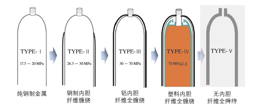 根据结构和材料的不同,美国机械工程师协会(ASME)和国际标准化组织(ISO)将储氢气瓶主要分为 5 种类型(图 1):I型(纯钢制金属瓶)、II型(金属内胆复合材料环向缠绕瓶)、III型(金属内胆复合材料全缠绕瓶)、IV型(塑料内胆纤维全缠绕瓶)和V型(无内胆纤维全缠绕瓶)。随着氢能产业的快速发展,对储氢气瓶的需求也在不断增加,深入研究CFRP在储氢气瓶中的应用对于推动氢能产业的发展具有重要意义。