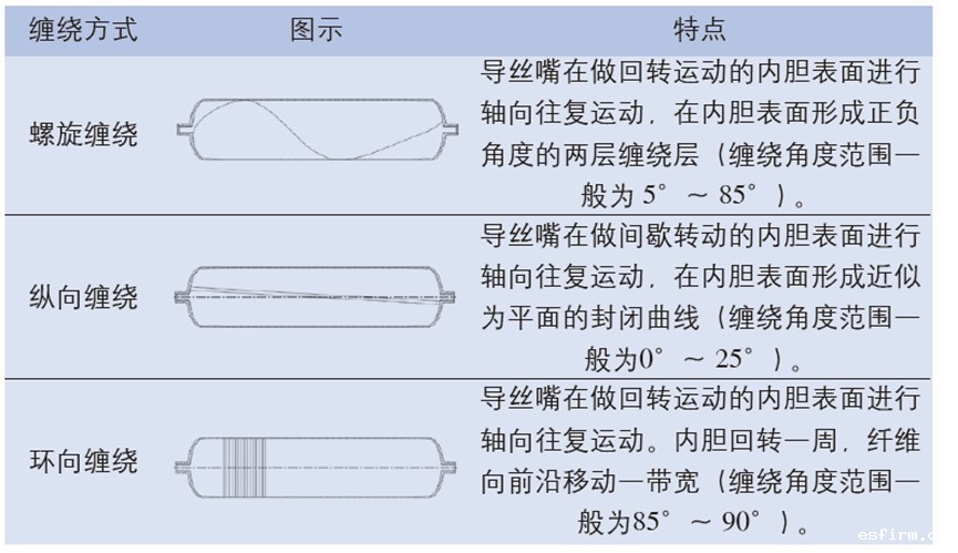 确定碳纤维缠绕工艺后,根据芯模形状和设计要求,进而确定碳纤维在内衬的表面缠绕方式,具体有螺旋缠绕、纵向缠绕、环向缠绕,相应缠绕特点和线型如表所示。