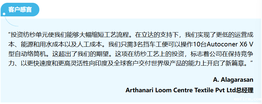 印度Arthanari Loom Centre Textile Pvt Ltd (ALC)是一家生产染色面料的纺织厂,该公司通过自建纺纱工序,缩短了工艺流程并削减了成本。配备无槽筒络纱技术Preci FX的立达自动络筒机Autoconer X6可根据ALC的要求对筒纱设计进行工艺优化,从而提高灵活性和效率。