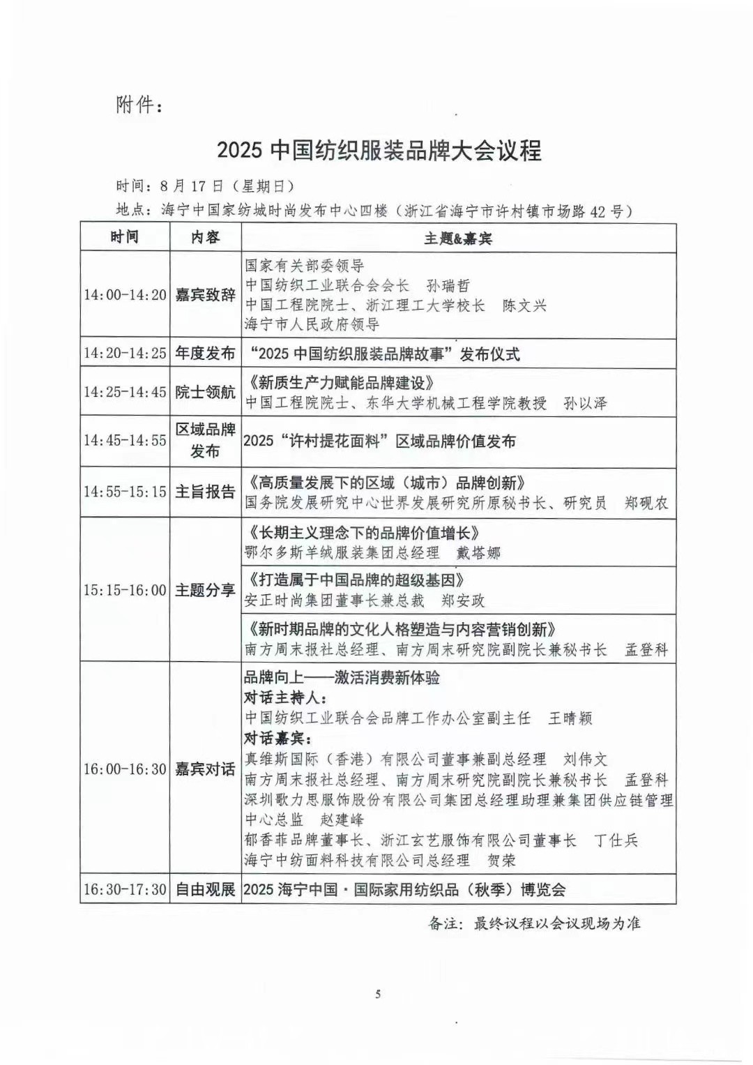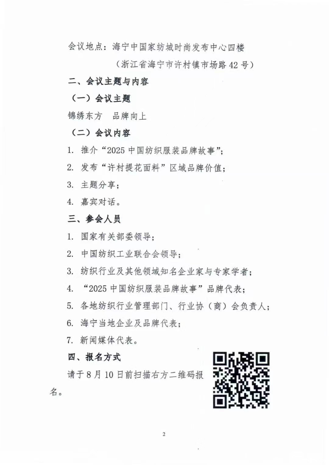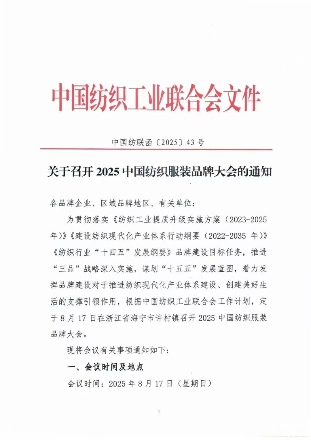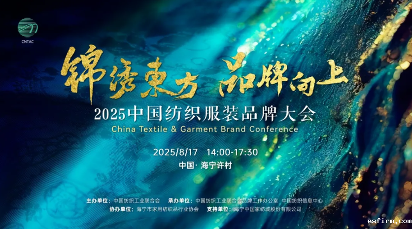 2025中国纺织服装品牌大会将于8月17日在浙江海宁许村镇召开。大会将以“锦绣东方 品牌向上”为主题,为行业搭建高端交流平台,共商品牌建设大计,赋能纺织现代化产业体系构建,点亮美好生活新图景。