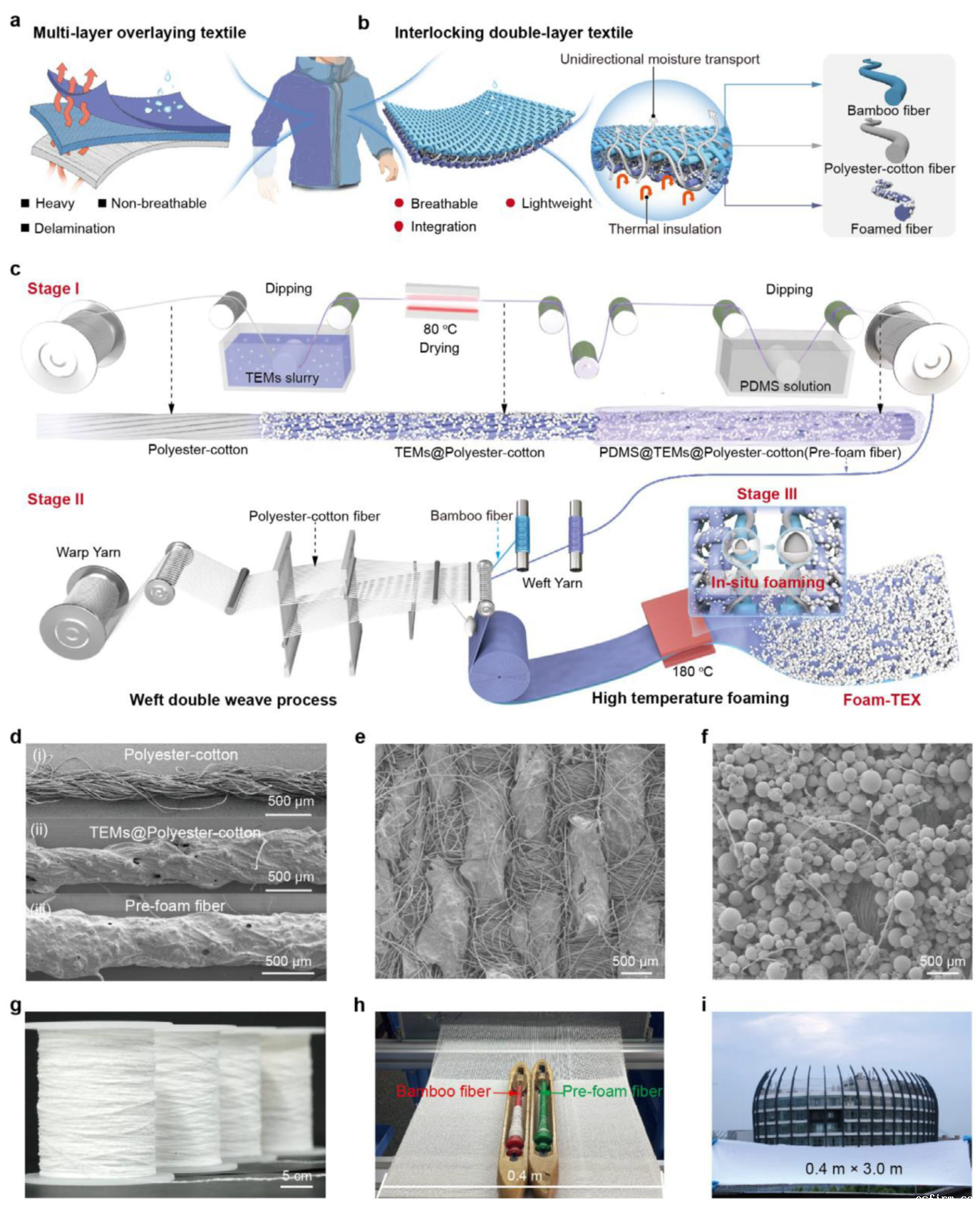 团队首先将聚酯棉纤维浸渍热膨胀微球(TEMs)浆料,经聚二甲基硅氧烷(PDMS)包覆形成预发泡纤维(图1d)。该纤维拉伸强度超300 MPa,适用于织造。随后通过剑杆织机将预发泡纤维与竹纤维交织成双层织物(图1e),再经180 ℃热处理触发微球膨胀,原位生成闭孔结构(图1f)。微球直径从30 μm增至155 μm,形成静态空气层阻断热传导。整套工艺可规模化生产0.4米宽幅织物(图1g-i),与现有服装生产线兼容。