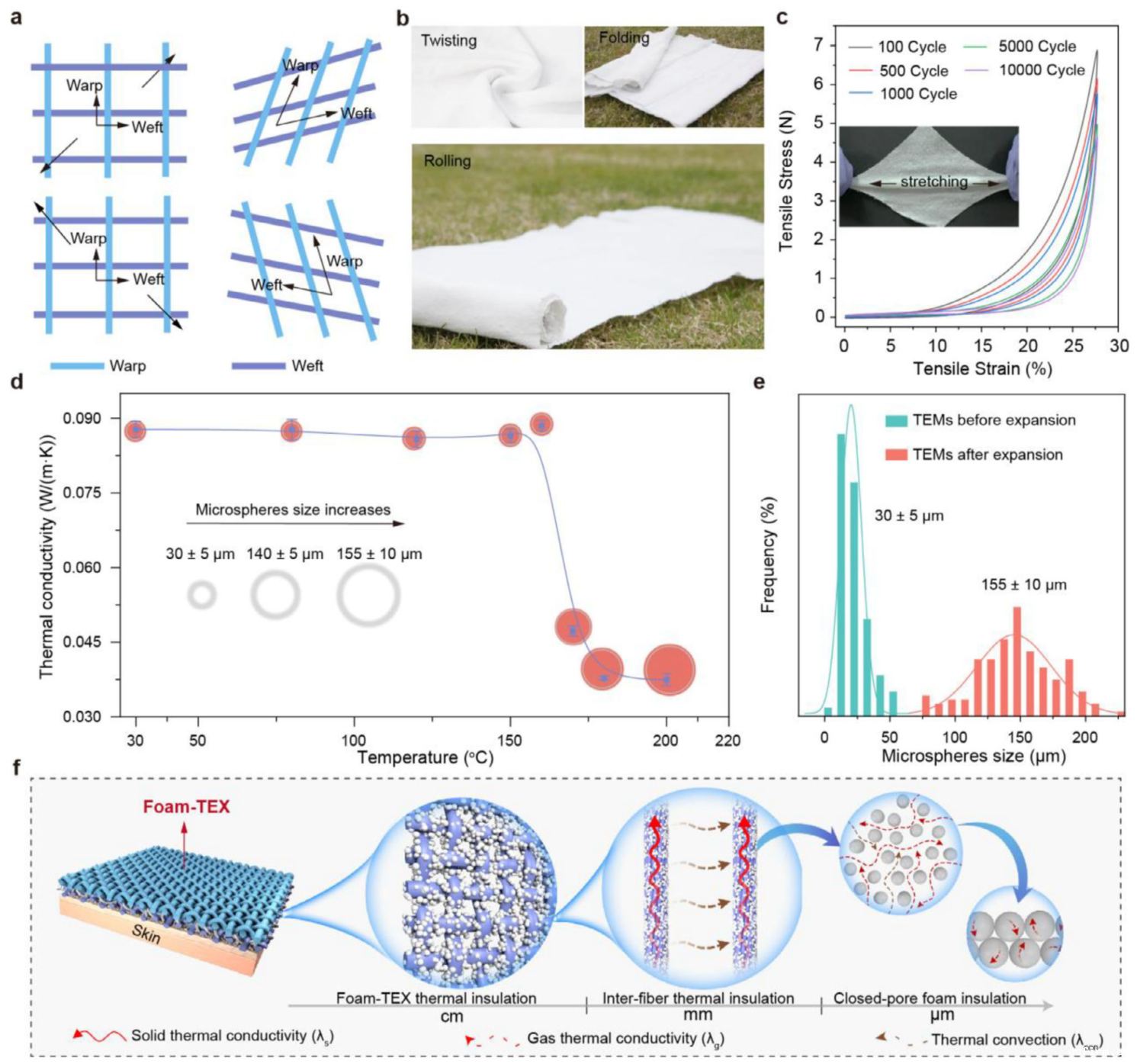 Foam-TEX具备独特的四向拉伸能力(图2a),可承受扭曲、卷折等形变(图2b)。经万次拉伸疲劳测试,滞后效应可忽略(图2c)。闭孔微球在180 ℃时达到最佳膨胀状态,使导热系数稳定降至0.039 W/(m·K)(图2d-e)。其保温机制通过三重作用实现:闭孔截留气体抑制热传导(λg)、减少纤维间空隙削弱对流(λconv),同时降低固相热传导(λs)(图2f)。