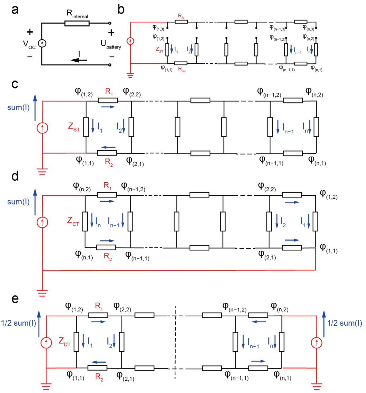图2 电场分析的等效电路模型 a) 简化电池模型。b) SECT电池等效电路。c-e) SECT、CECT和DECT电池的集成等效电路计算模型。