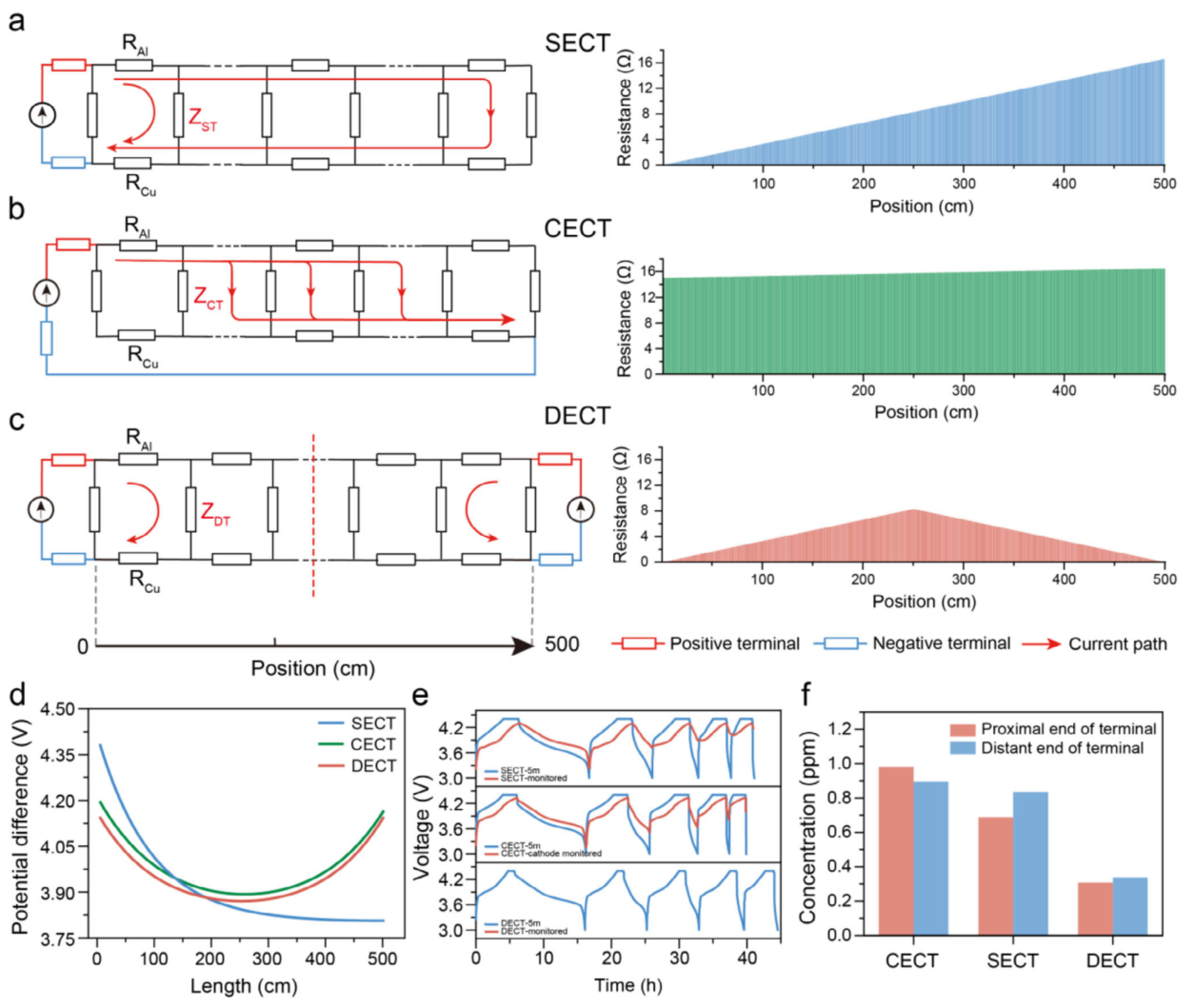 团队构建了精细化等效电路模型(图2),将单位电池内阻分解为正极集流体电阻(RA1)、负极集流体电阻(RC1)和极化阻抗(Z)。模拟显示:SECT设计因远端电阻累积造成严重极化(图3a);CECT虽电场均匀但电子需穿越全长集流体,内阻最高(图3b);DECT则通过双端分流将最大电子传输距离减半,实现全域均匀电位分布(图3c)。电位差分析进一步证实DECT的电场均匀性最优(图3d)。