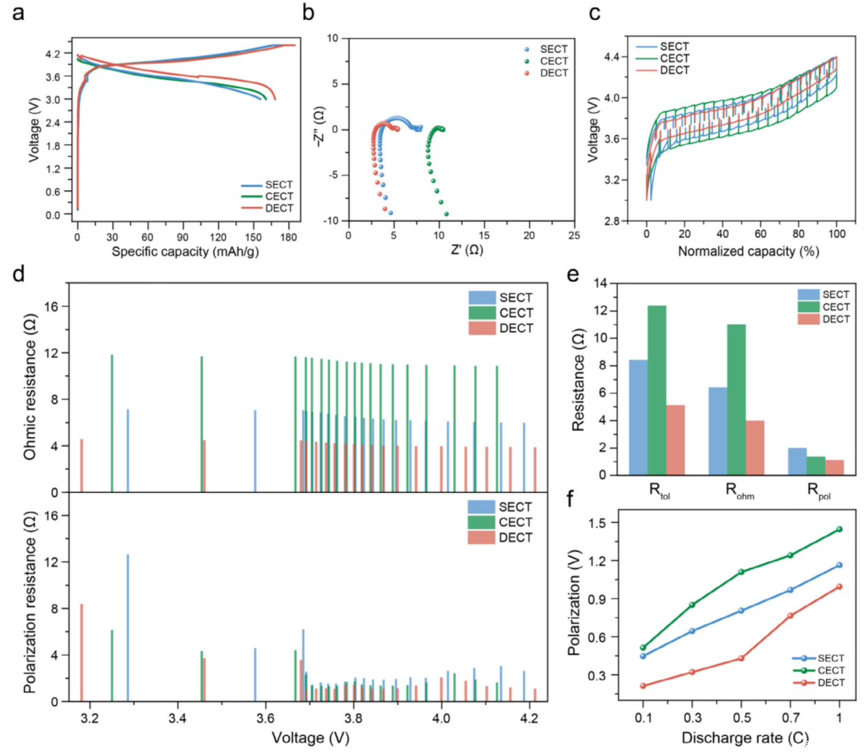 图4 5米长L-FLIBs内阻与极化分析 a) 化成循环充放电曲线。b) 奈奎斯特图。c) 恒电流间歇滴定(GITT)结果。 d) GITT脉冲计算的欧姆电阻与极化电阻。e) 50%荷电状态下的内阻对比。f) 不同放电倍率下的极化电压。