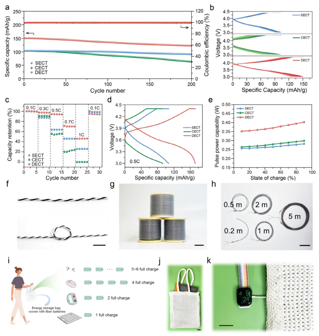 团队将8根5米长DECT电池编织成织物电源包(图5j),成功为智能手表充电(图5k)。电池在弯折(10万次后容量保持93.5%)、挤压、锤击等极端形变下仍稳定运行,彰显其在可穿戴场景中的实用性与鲁棒性。