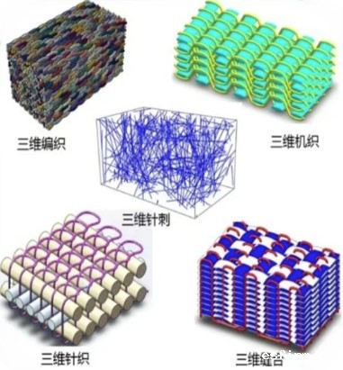 二维结构复合材料通常以机织物、针织物或非织造布与基体材料复合而成;三维结构复合材料是纤维在三维空间相互交织形成整体后再与基体材料复合而成。
