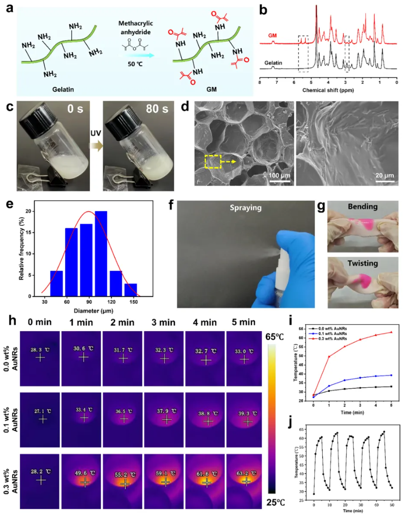 光热性能测试表明,随着AuNRs含量的增加,水凝胶在808 nm NIR照射下温度迅速上升,最高可在5分钟内升高35°C,且经过5次循环后仍保持稳定的升温能力,说明其具备可靠的光热转换性能。体外抗菌实验进一步证实,经NIR照射后,该水凝胶对大肠杆菌和金黄色葡萄球菌的杀菌效率均超过99.9%。