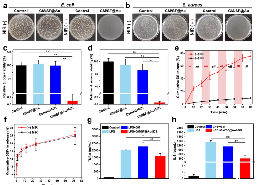 在药物释放方面,研究实现了NIR触发的按需释放模式。无照射时,DS释放缓慢平稳;一旦照射,PLGA纤维温度超过玻璃化转变温度,DS释放显著加速。而SDF-1α则呈现持续缓释行为,两者形成时序协同释放,符合伤口愈合过程中先抗炎后促再生的生物学需求。抗炎实验表明,该水凝胶能显著降低由LPS诱导的巨噬细胞中TNF-α和IL-6的表达,显示出良好的抗炎效果。