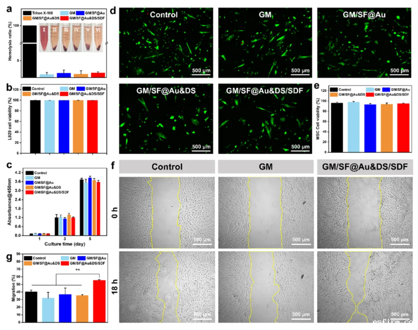 生物相容性实验结果良好,所有水凝胶组溶血率低于2%,细胞毒性低,并能促进L929细胞和间充质干细胞(MSCs)的粘附与增殖。划痕实验显示,含SDF-1α的水凝胶能显著促进MSCs迁移, scratch修复面积达55.3%,明显高于对照组。