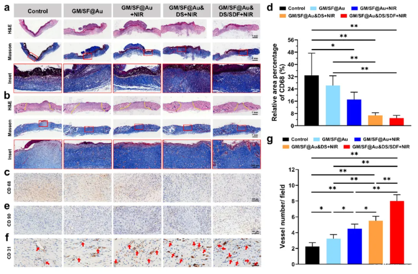 在大鼠金黄色葡萄球菌感染伤口模型中,该水凝胶结合NIR照射能迅速将伤口温度升至50°C,有效清除细菌。治疗15天后,GM/SF@Au&DS/SDF + NIR组伤口几乎完全愈合,组织学染色显示更完整的皮肤结构、更成熟的胶原沉积、更少的炎症细胞(CD68+),以及更多的MSCs(CD90+)和血管(CD31+),表明其具有优异的促愈合能力。RNA测序分析进一步揭示,该治疗可抑制IL-17等炎症相关信号通路,证实其在分子水平上缓解过度炎症反应。