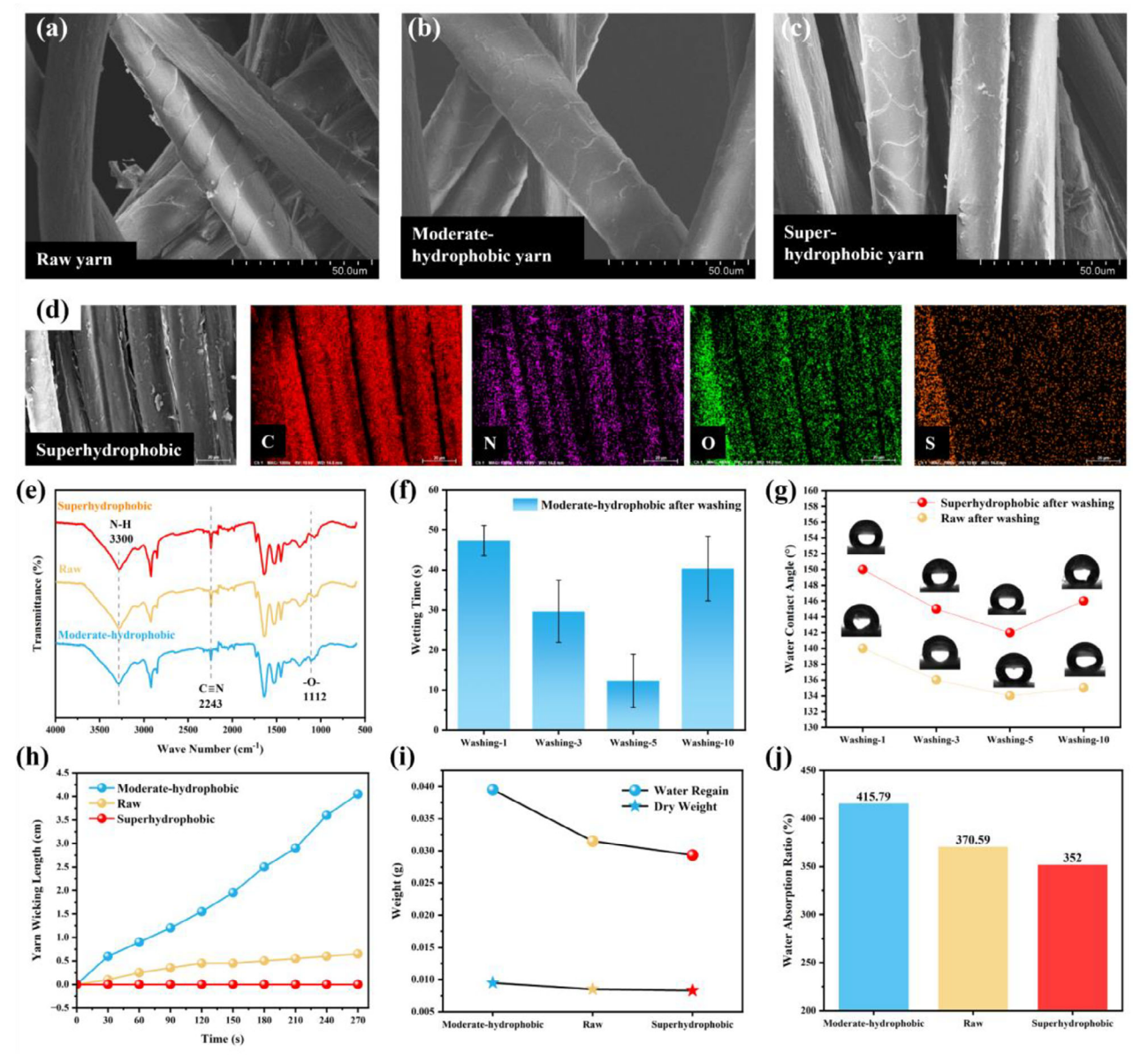 图1. a) 原始纱线的SEM图像 b) 中等疏水纱线的SEM图像 c) 超疏水纱线的SEM图像 d) 超疏水纱线的元素分布 e) 纱线的FTIR红外光谱分析 f) 中等疏水纱线织物洗涤后的润湿时间 g) 原始纱线与超疏水纱线织物洗涤后的表面接触角 h) 纱线的芯吸长度测试 i) 不同纱线的吸水量 j) 不同纱线的吸水率