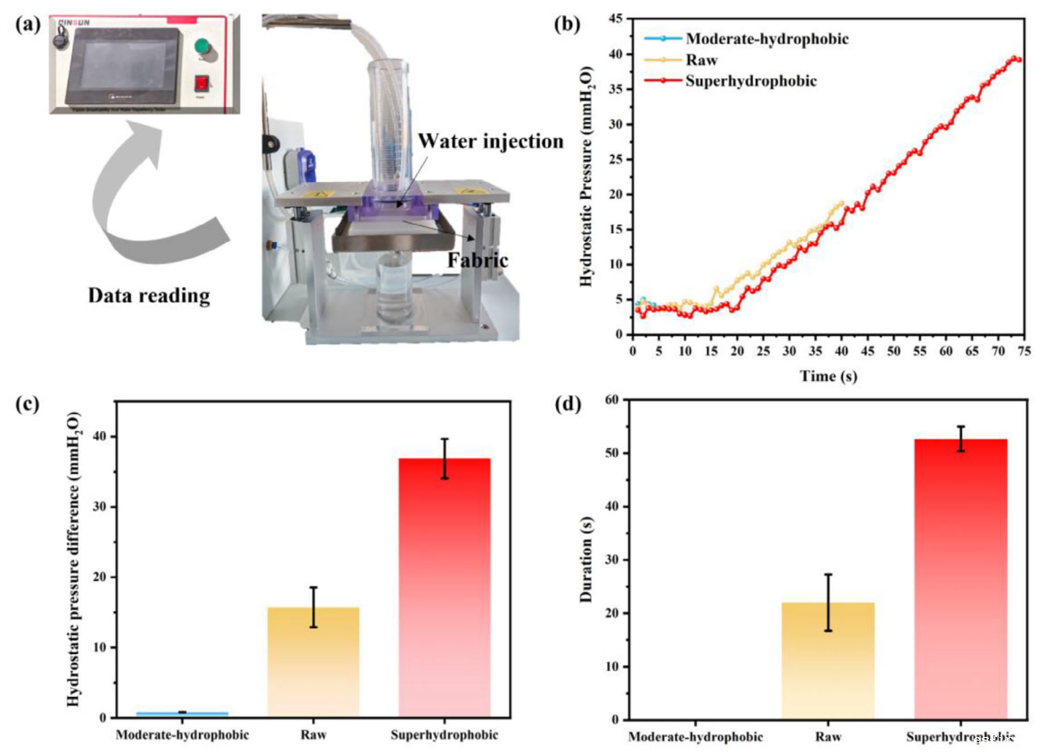 图2. a) 织物静水压测试装置 b) 三种类型织物的静水压变化 c) 三种织物的最大静水压差 d) 三种织物的注水持续时间