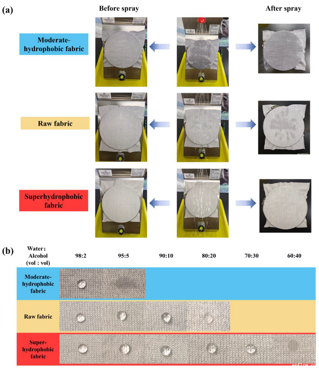 进一步对单一润湿性纱线所编织的面料进行测试,在静态水压实验中,超疏水面料具有最长的进水时间(52.67 s)和最大水压差(36.87 mmH₂O),中等疏水面料则几乎无静水压。抗溅性测试中,超疏水面料获得了最高4级评级,而中等疏水面料抗湿性较差。水/乙醇溶液抗湿实验也验证了超疏水面料对高浓度酒精滴液仍具有良好的排斥能力。