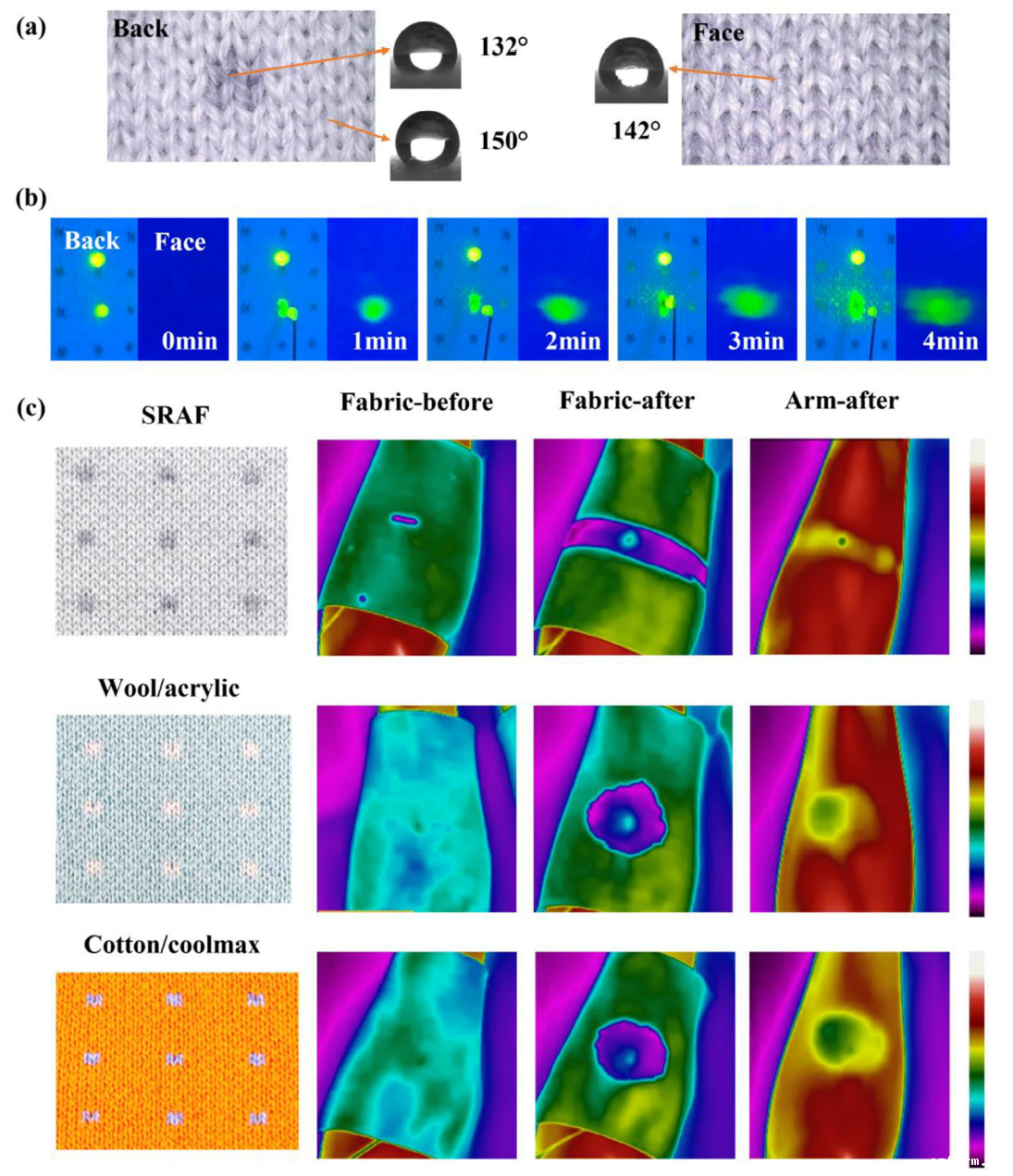 图4. a) SRAF织物的正反面细节及接触角 b) 1 mL液滴测试 c) 人体手臂覆盖不同织物后的效果对比