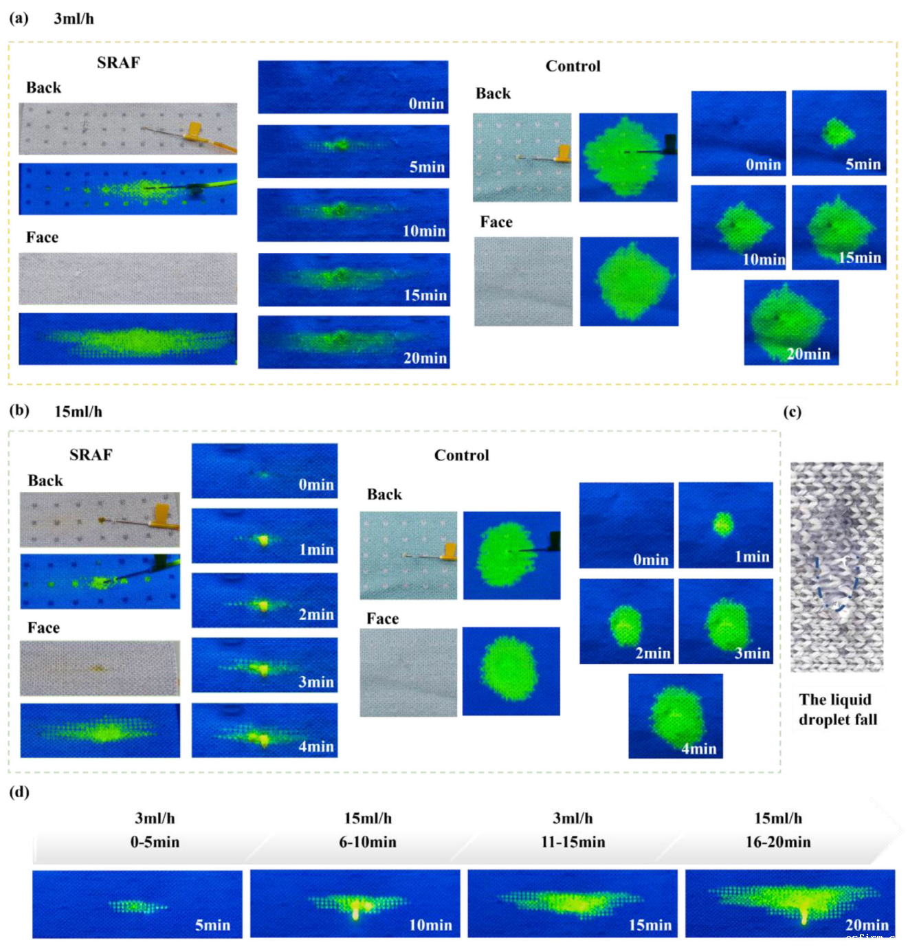 图5. a) 3 mL/h注水速率下SRAF与对照织物的润湿状态对比 b) 15 mL/h注水速率下SRAF与对照织物的润湿状态对比 c) 液滴从织物正面滴落 d) 注水速率在3与15 mL/h之间切换时SRAF的润湿状态