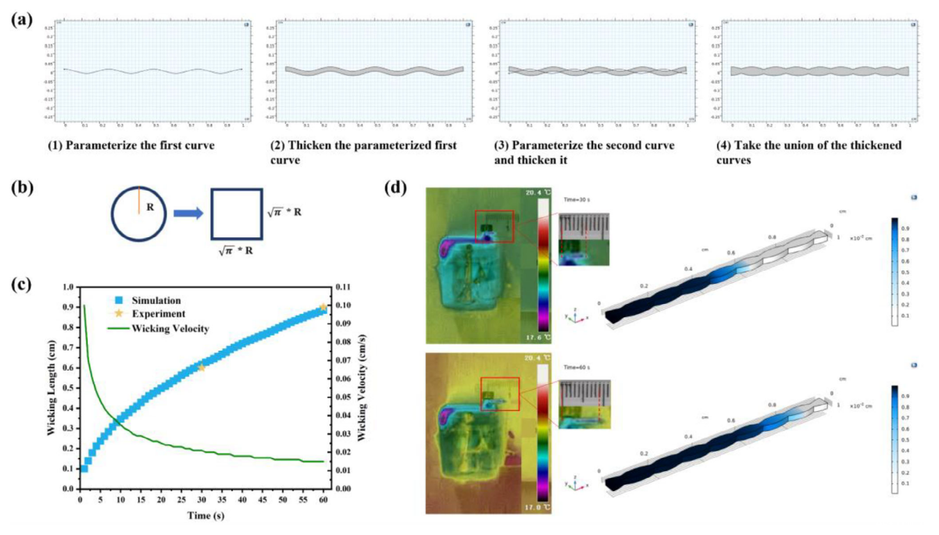 通过COMSOL多物理场仿真,研究团队建立了中等疏水纱线的芯吸模型,模拟结果与实验数据误差小于3%,验证了模型的有效性。此外,通过纱线渗透率预测织物芯吸行为,误差低于5%,实现了从纱线到织物的多尺度性能关联。