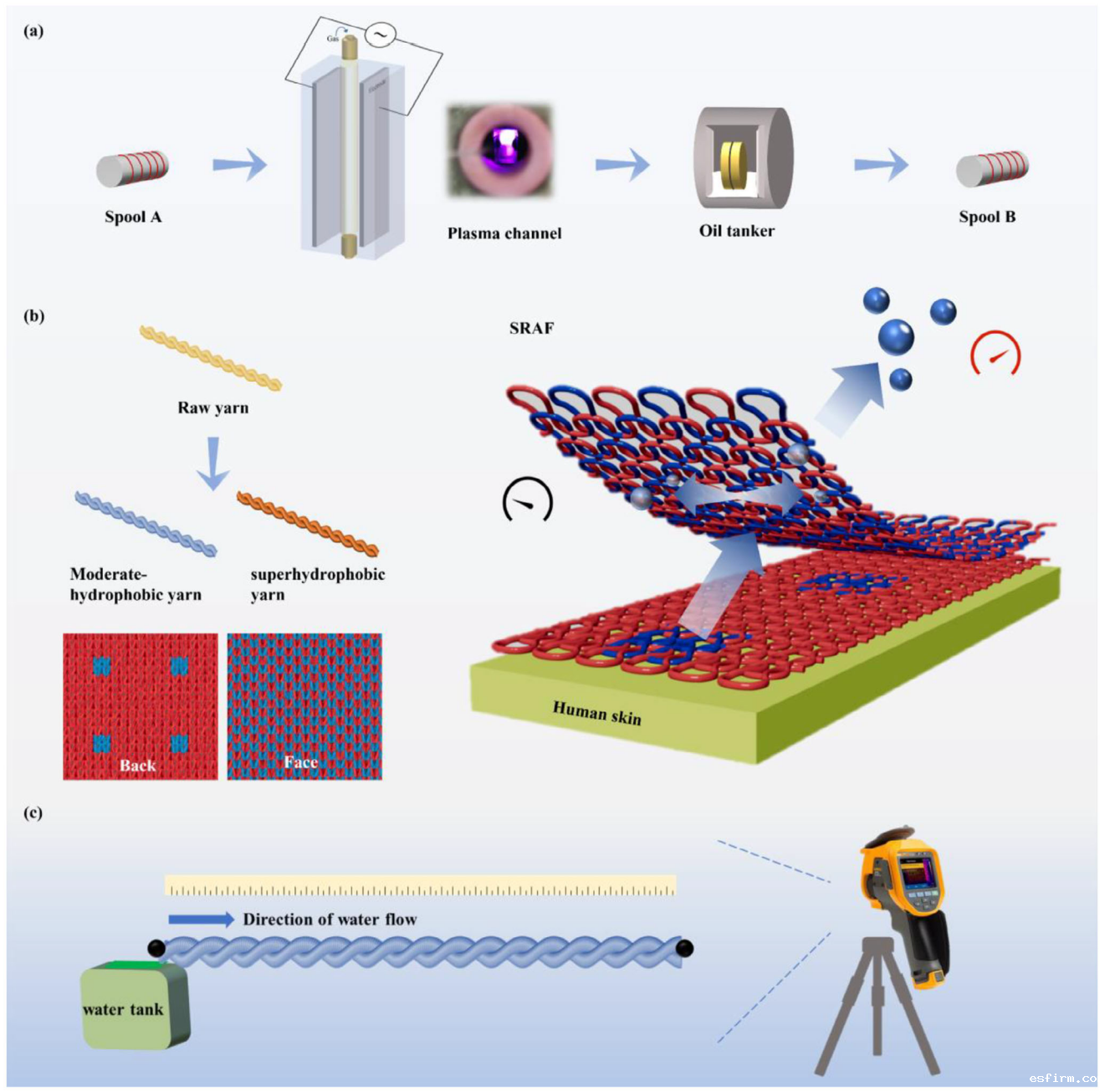 图9. a) 中等疏水与超疏水纱线表面等离子预处理装置示意图 b) SRAF织物的三维视图 c) 中等疏水纱线芯吸长度测试平台
