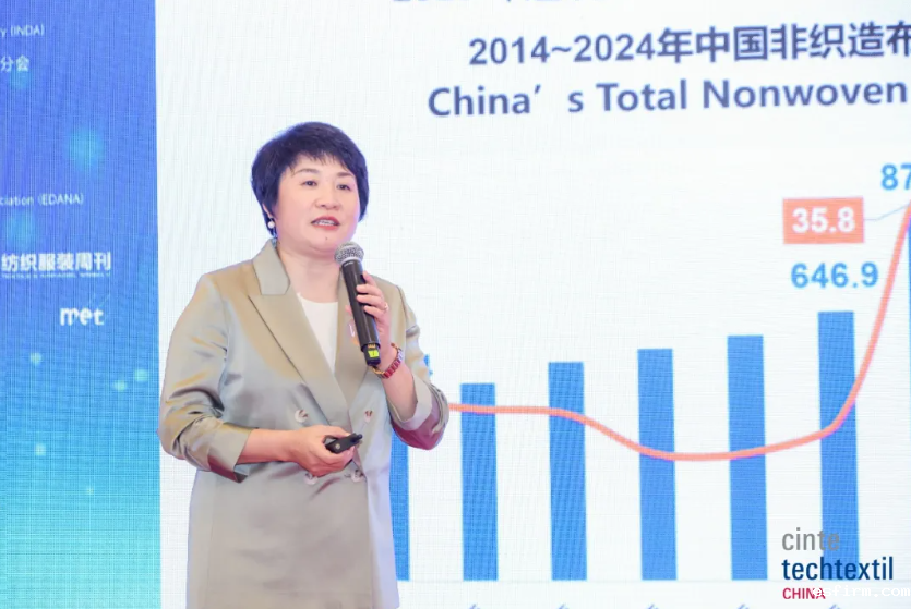 中产协会长李桂梅在“2025:中国非织造布行业的挑战与未来”主题报告中探讨了中国非织造布行业的现状、挑战与未来发展之路。当前全球非织造布市场进入恢复性增长阶段,中国非织造布行业也呈现回暖态势,2024年我国非织造布产量达856.1万吨,医疗、卫生、擦拭、包装等领域应用占比显著;行业盈利有所改善但整体承压;企业对新增产能投资更为谨慎,新疆凭借成本与政策优势成为新兴投资热点;出口逆势增长,东盟成为我国非织造布最大的出口区域市场;行业的集中度提高,2024年我国非织造布产量排名前十的企业的产量约占非织造布总产量的11%;科技创新步伐加快,推动了行业高端化发展的进程。展望未来,她表示,行业将持续推进技术创新与绿色转型,强化产业链协同能力,积极拓展高附加值应用领域,培育具有国际竞争力的龙头企业,推动非织造布产业实现高端化、可持续发展。