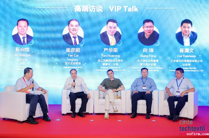 此外,会上还设置了高端访谈环节,东华大学教授靳向煜作为主持人,中产协副会长、卫生和母婴用品分会会长,金三发集团&优全股份董事长、总裁严华荣;中产协副会长、土工建筑材料分会会长,东方雨虹控股董事兼天鼎丰总裁向锋;中产协副会长、Magnera亚太区总经理崔彦昭;中产协副会长、江苏蓝天环保集团股份有限公司总经理崔渊文作为访谈嘉宾针对疫情后非织造行业发展特点、终端市场需求、行业技术创新等议题畅所欲言。针对纺织行业“内卷”问题,崔彦昭认为,破解内卷的根本在于坚守质量和持续研发,以产品创新来把握市场机会。严华荣建议行业组织应正确引导行业发展,媒体应客观报道行业情况,但最终企业需要顺应市场,适者生存。向锋将“内卷”归结为“价格战、资金战、质量战”,破解之道在于经历行业洗牌,通过自然规律提升行业集中度,才能走向健康发展。崔渊文则建议通过搭建生态圈、拓展业务链来构建企业自己的护城河。访谈嘉宾还重点讨论了医疗卫生用非织造产品、高温过滤非织造产品及土工合成材料的发展情况,并探讨了如何拓展海外市场、智能化数字化技术在生产环节中的应用等热点话题。
