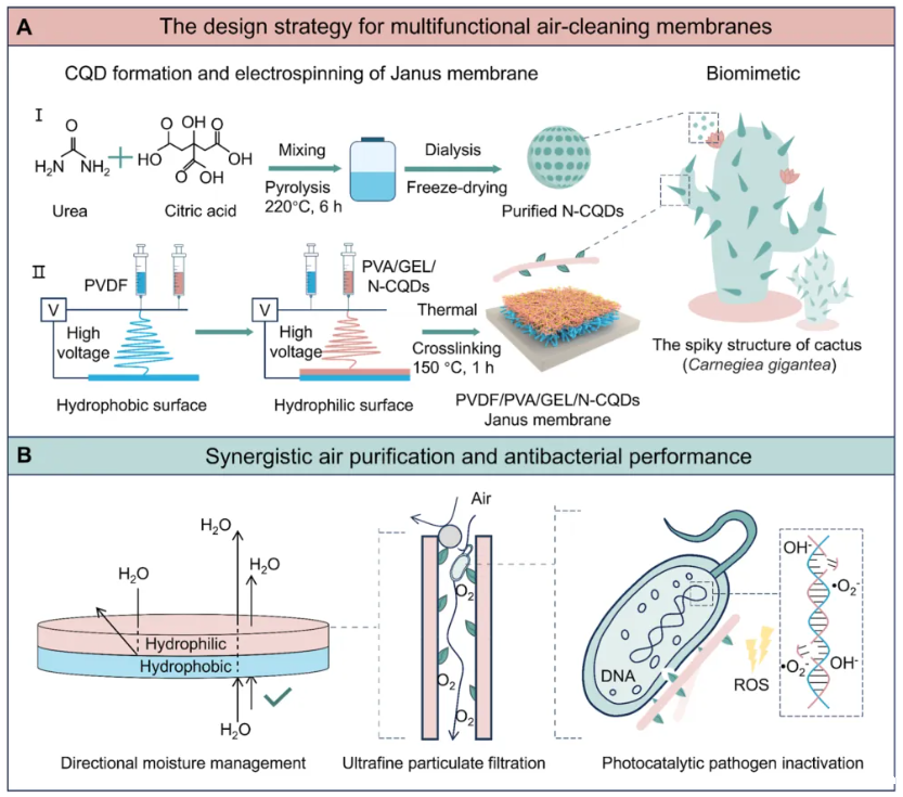 南京工业大学刘泽贤教授、仲兆祥教授合作成功开发出一种光活性Janus纳米纤维膜,通过顺序静电纺丝技术构建具有不对称润湿性的双层结构。该膜一面为嵌入氮掺杂碳量子点(N-CQDs)的亲水层,另一面为疏水微通道层,仿生仙人掌刺与花粉结构,实现单向水分传输、高效气溶胶过滤和紫外激活下的病原体灭活。该膜对PM0.3的截留率超过99.59%,并在30分钟内对革兰氏阳性和阴性细菌实现6-log(99.9999%)灭活,同时具备优异的循环稳定性,10次使用后仍保持98.5%的过滤效率。相关论文以“Multifunctional Photoactive Janus Nanofibrous Membranes for Unidirectional Water Transport and Remediation of Airborne Pathogens and Pollutants”为题,发表在ACS Nano上。
