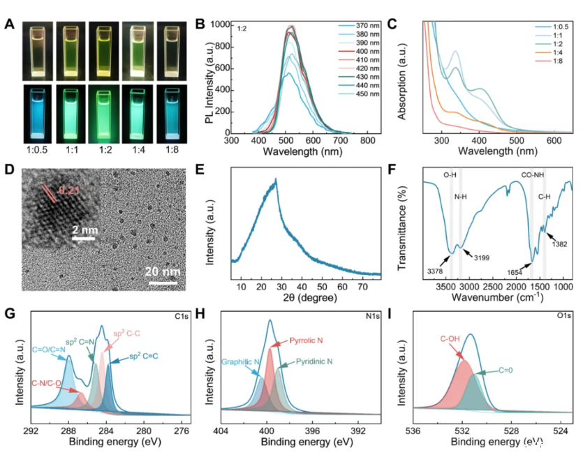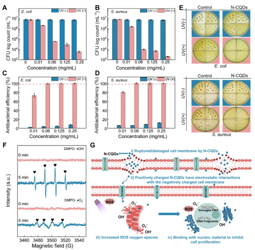 研究团队首先通过柠檬酸与尿素的固相热解合成了N-CQDs,并系统优化了其摩尔比例。当比例为1:2时,N-CQDs表现出最强的绿色荧光和单指数荧光衰减行为,说明其具有稳定的激子行为和高效ROS生成能力。结构表征显示,N-CQDs粒径为2~5 nm,具有石墨晶格和丰富的含氧、含氮官能团,为其光催化活性提供了基础。在抗菌实验中,N-CQDs在紫外光激活下5分钟内即可实现99.99%的细菌灭活,其机制主要通过产生活性氧物种(ROS)引起氧化损伤。