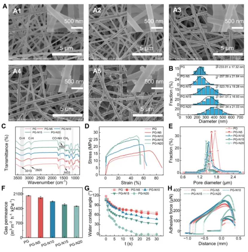 随后,团队通过顺序静电纺丝制备了PVDF疏水层和N-CQDs掺杂的PVA/GEL(PG-N)亲水层组成的Janus膜。随着N-CQDs负载量增加,纤维直径逐渐增大,且在15%以上负载时出现片状或花苞状分级结构,显著增强了膜的机械强度和亲水性。PG-N20膜(20% N-CQDs)表现出零度水接触角和高粘附力,适合作为亲水层用于构建Janus结构。