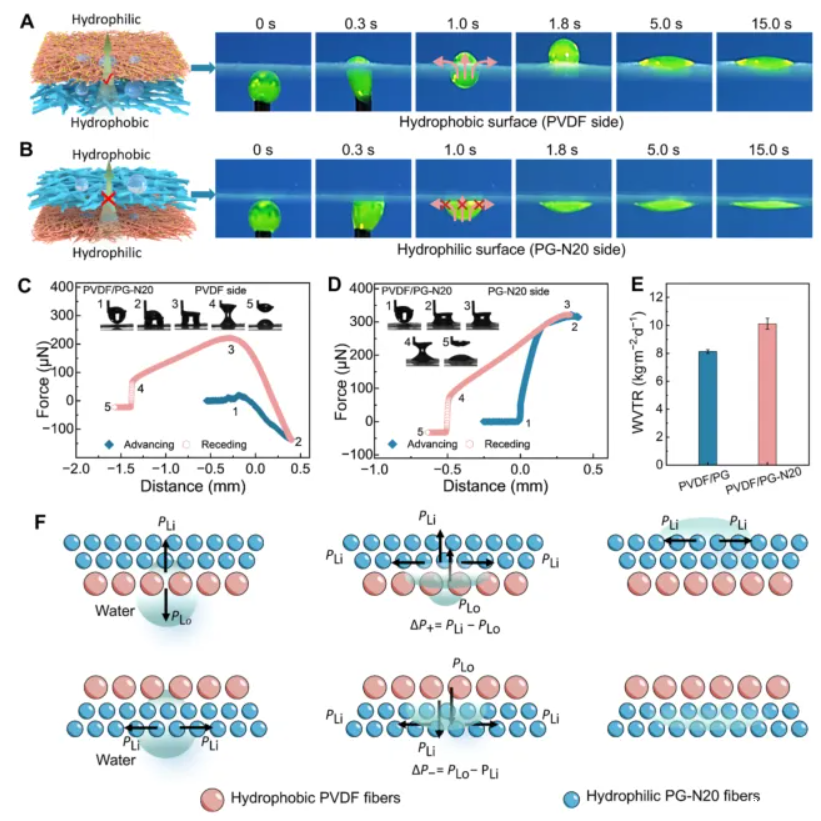 在单向输水行为研究中,该膜表现出明显的方向性:水滴从疏水PVDF侧能迅速渗透至亲水PG-N20侧,而反向则被有效阻挡。荧光示踪和微力测量进一步证实了其抗重力单向输水能力。该行为由不对称毛细压力驱动,亲水层产生正毛细压力吸引水分,疏水层产生负压力阻隔反向渗透。
