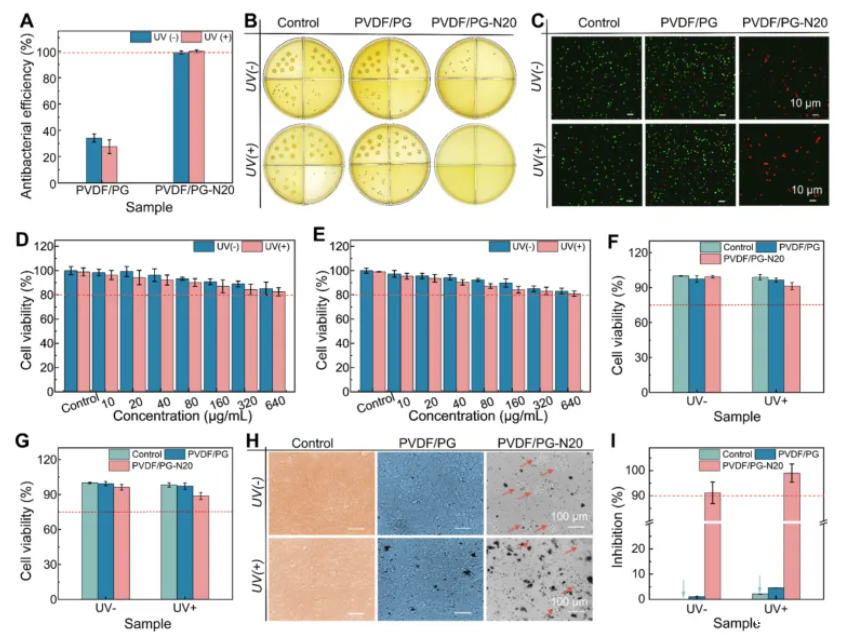 此外,该膜还表现出优异的生物相容性和抗病毒性能。在细胞实验中,N-CQDs和复合膜均未表现出明显细胞毒性。针对H1N1病毒,PVDF/PG-N20膜在黑暗条件下即可实现91.2%的抑制率,紫外激活后提升至99%。其抗病毒机制包括静电吸附、高效过滤和光催化灭活三者协同。