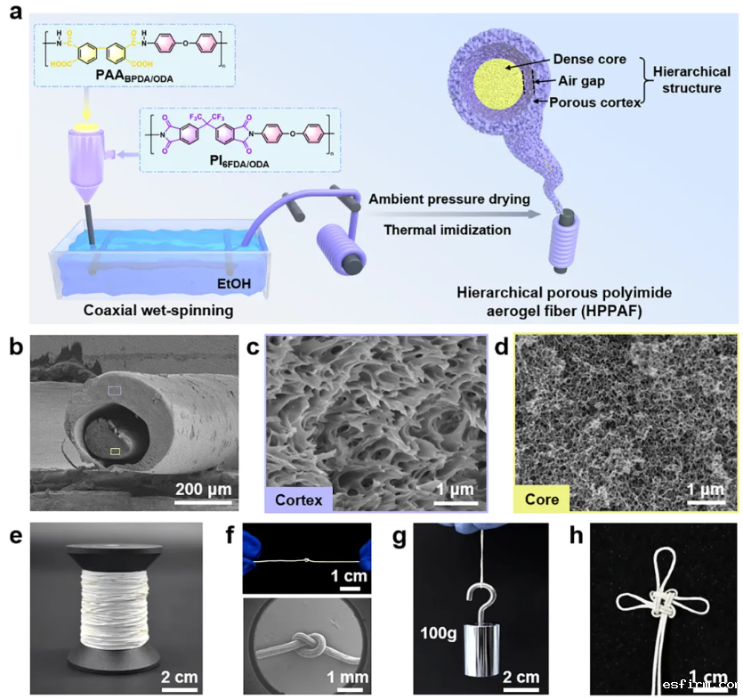 该工作基于同轴湿法纺丝结合常压干燥技术,采用可溶性含氟聚酰亚胺(PI6FDA/ODA)作为皮层纺丝液,聚酰胺酸(PAABPDA/ODA)作为芯层纺丝液,通过同轴针头共挤出至乙醇凝固浴中进行溶剂置换。纤维固化后经卷辊收集,依次进行常压干燥及热亚胺化制得高性能聚酰亚胺气凝胶纤维(HPPAF)。在凝固浴中,由于皮层和芯层纺丝液在溶解度和相分离速率上的差异,HPPAF形成了独特的分级结构:疏松多孔的皮层、致密的芯层以及二者之间的气隙。聚酰亚胺皮层的疏松多孔结构以及气隙确保HPPAF优异的隔热性能,而芯层的致密结构主要提供力学强度,有效解决了聚酰亚胺气凝胶纤维中力学和隔热性能难以兼顾的难题。与此同时,皮层纺丝液中的三氟甲基有效降低了纤维的表面能,使得常压干燥成为可能,实现了气凝胶纤维的高效连续制备。