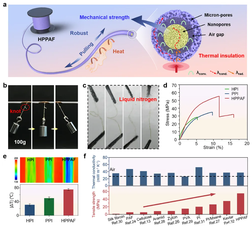 气凝胶纤维具有高孔隙率、低热导率和柔性等特性,在个人热管理领域展现出巨大的应用潜力。然而,气凝胶纤维的多孔结构显著削弱了其拉伸强度等力学性能。同时,由于纺丝技术的局限性,气凝胶纤维的制备依赖冷冻干燥或超临界干燥等后处理步骤,难以实现连续制备。因此,如何平衡气凝胶纤维的力学性能与隔热性能,并实现其高效连续制备,仍是重大挑战。