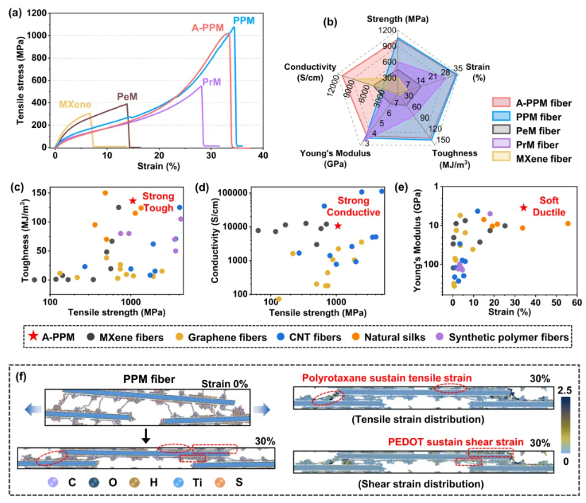 力学性能测试结果(图2a,b)显示,相较于纯MXene纤维和其他单界面改性纤维,具备双界面的PPM纤维实现了强度、韧性和延展性的同步显著提升。其综合性能超越了绝大多数已报道的MXene纤维,甚至可与天然蚕丝等高性能纤维相媲美(图2c)。同时,该纤维展现出较低的杨氏模量(即高柔软度)和优异的导电性(图2d,e)。分子动力学模拟(图2f)揭示了双界面的协同作用机制:在拉伸过程中,聚轮烷链主要承受拉伸应变,而PEDOT区域则承担界面剪切应力,从而有效维持了相邻MXene纳米片间的载荷传递,延缓了应变局部化,使得纤维在断裂前能更有效地利用聚轮烷链,实现了强度、延展性和韧性的同步提升。
