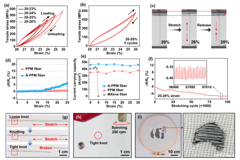 除了卓越的静态力学性能,PPM及其银纳米线涂层版本(A-PPM)纤维还表现出出色的弹性、耐久性和环境稳定性(图4)。循环拉伸测试表明,A-PPM纤维具有高弹性回复能力和极小的残余应变(图4a-c)。即使在拉伸至25%应变时,其电阻仅轻微增加(图4d),载流能力保持稳定(图4e),并且在超过10万次的拉伸-释放循环后,电导率不仅没有衰减,反而因银纳米线沿轴向更好排列而略有提升(图4f)。纤维还具备优异的打结效率(图4g,h)和可编织性(图4i),能够轻松地进行编织、刺绣,并承受反复洗涤,满足了实际纺织应用的需求。