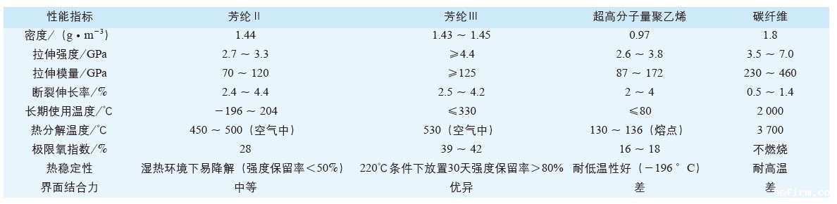 碳纤维虽同样具有高强高模、质轻特性,但因其断裂韧性差、吸能有限,通常作为外层材料包裹于上述材料主体,提供极高的刚性和硬度,以增加头盔结构性强度,并防御钝击创伤。表 1 为以上主要纤维材料性能对照情况。