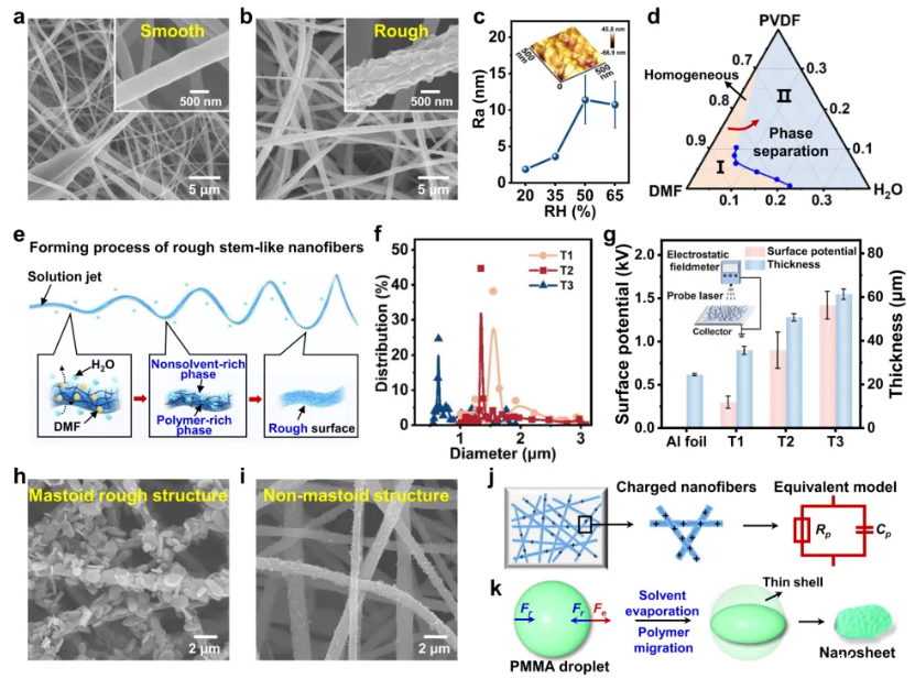 在纳米纤维的设计中,高湿度环境加速了射流相分离与固化,形成表面粗糙的茎状纤维(图2a–c)。三元相图揭示了溶剂与非溶剂的交换动力学如何引导相分离行为,进而形成可作为锚定点的粗糙表面(图2d,e)。通过调控纺丝时间,研究人员实现了对纤维膜孔径与表面电位的精确控制(图2f,g)。低表面电位的收集器(如铝箔和薄纳米纤维膜)更易诱导带电PMMA液滴形成叶状纳米片(图2h,i),其形成机制涉及电场力驱动下液滴的拉伸与固化过程(图2j,k)。